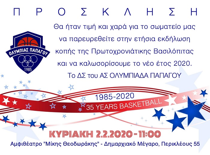 35 χρόνια ζωής συμπληρώνει φέτος η Ολυμπιάδα Παπάγου. Το Παπαγιώτικο σωματείο μπάσκετ προγραμματίζει να κόψει την πρωτοχρονιάτικη πίτα την Κυριακή 2 Φεβρουαρίου 2020 στις 11 π.μ. το πρωί στο Αμφιθέατρο του Δημαρχιακού Μεγάρου.